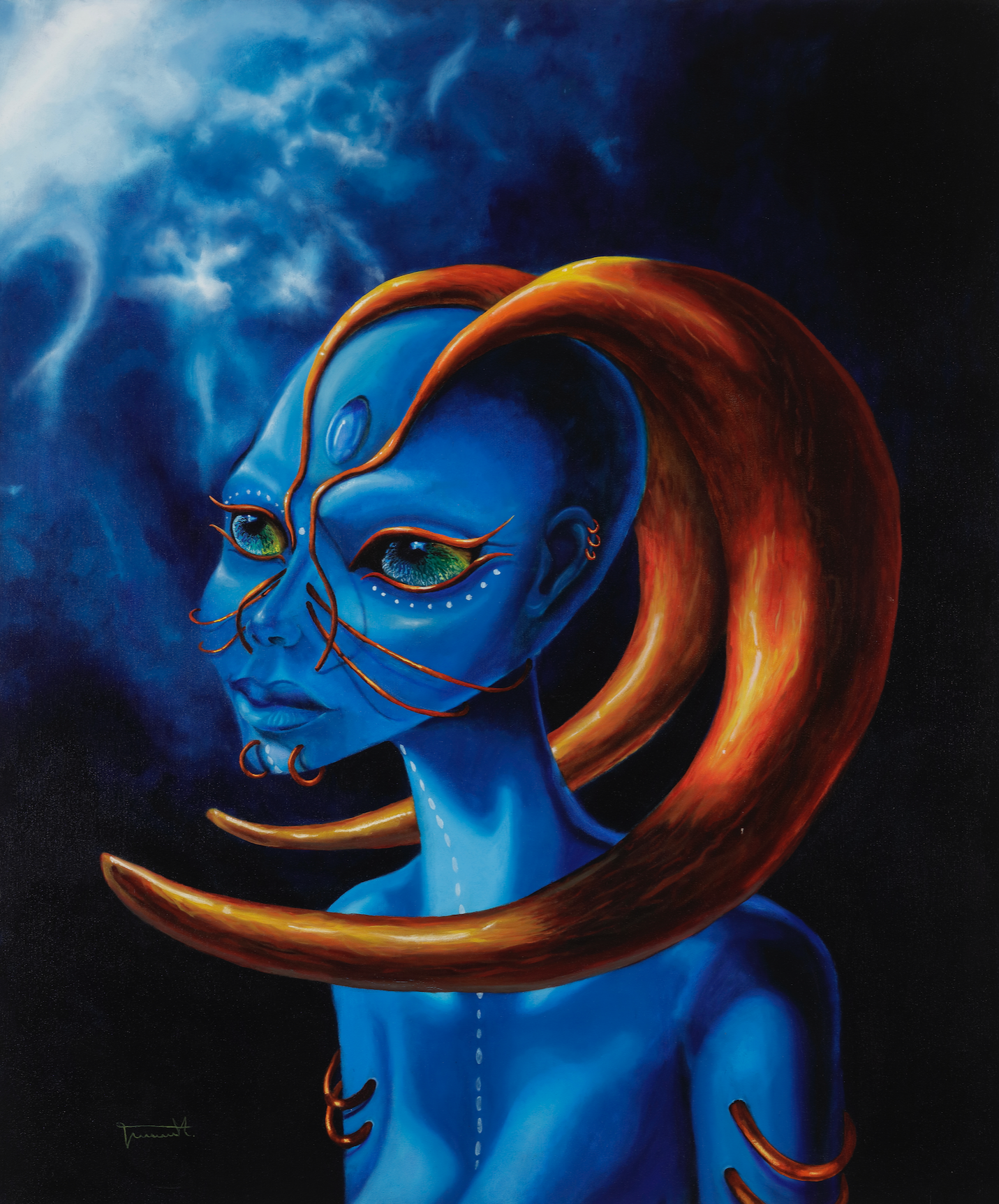 Created when Tatum Careyes was 14 years old, Horn-Y carries a deeply personal meaning. Created by a vision Tatum had months before the passing of her father, this piece is a tribute to his influence and motivation in her life. The painting’s title, was a funny Innocent accident from her kid years, and it stuck over time! This became a lasting symbol of humor and love—a reflection of her father's own humor towards life’s unexpected turns, keeping his spirit and love alive.